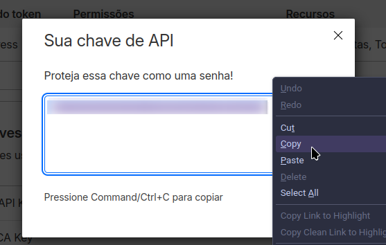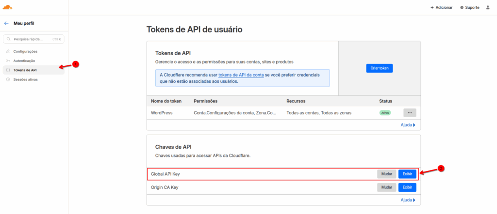 3. Clique em Tokens de API e na seção “Chaves de API”, clique no botão Exibir no item “Global API Key”;