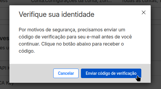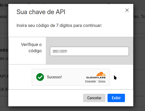 4. Pode ser que, por segurança, a Cloudflare exija uma verificação por um código de 7 dígitos enviado ao e-mail cadastrado na conta, basta copiar o código enviado para a caixa de e-mail e colar em “Verifique o código”, após isso, clique em “Exibir”.;