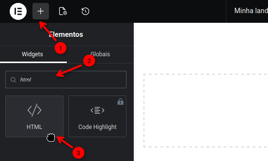 2. Em “+” (mais), na aba Widgets, pesquise por “HTML” e clique no widget de HTML.