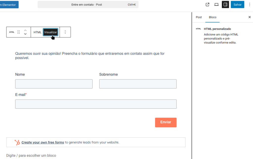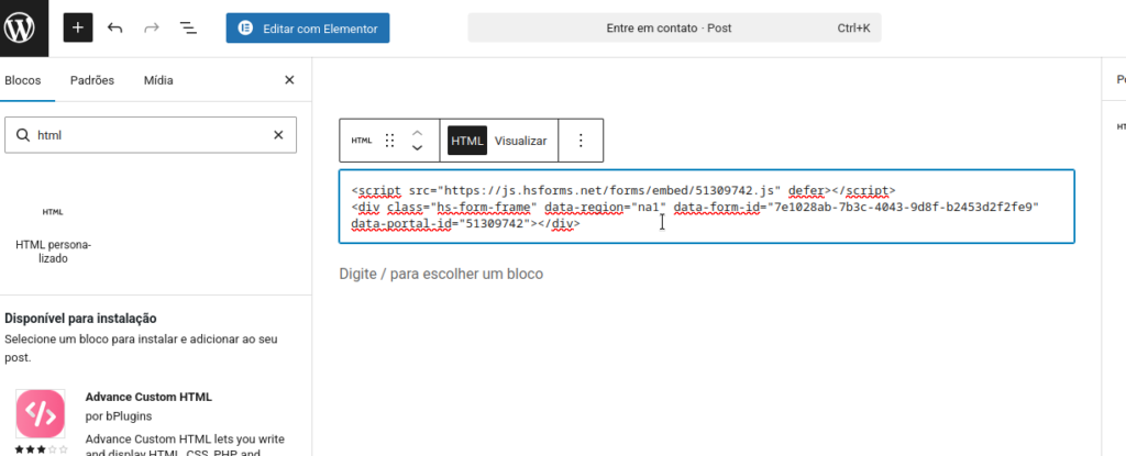 3. Cole o código HTML no bloco.