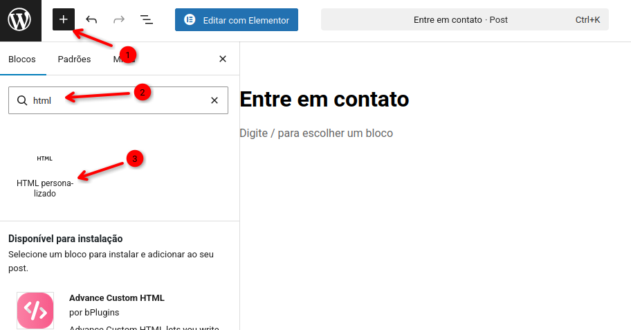 2. Na página de edição, clique no “+” (mais) e pesquise por “HTML” e clique no bloco “HTML personalizado” para adicionar a página.