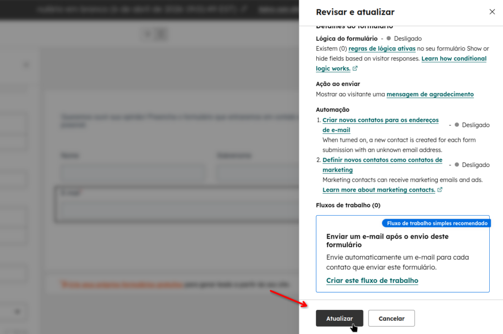 6. Irá aparecer uma confirmação à direita, clique em “Atualizar” para confirmar.