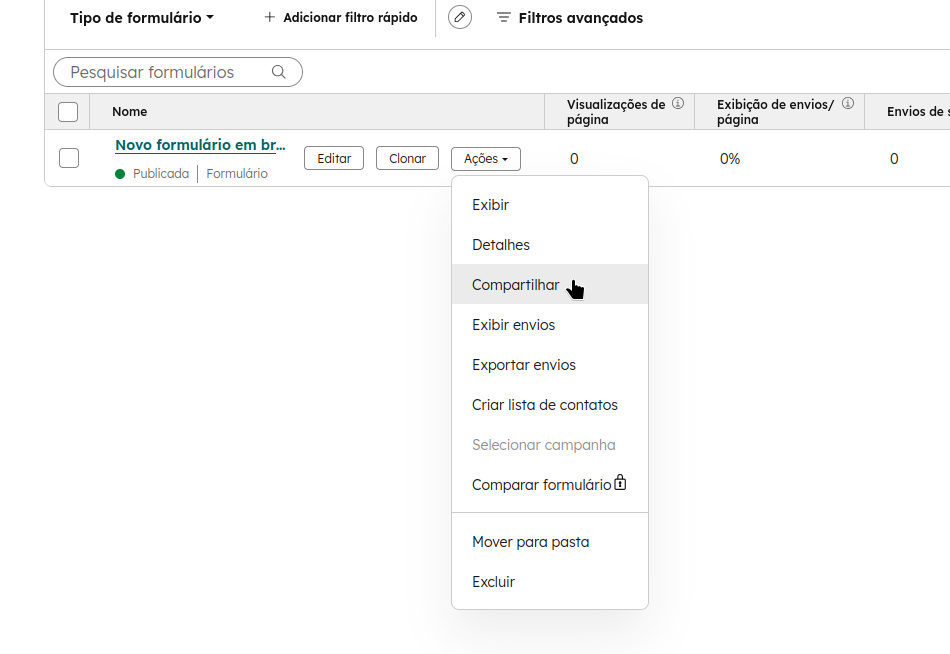 3. Na lista, aponte o mouse para o nome do formulário em questão e clique em “Ações” > “Compartilhar”.