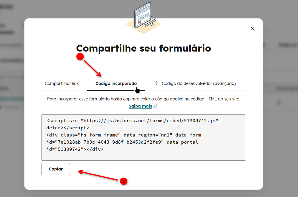 4. Clique na aba “Código incorporado” e depois copie o código da caixa de texto abaixo (você poderá clicar em “Copiar” que fará a cópia deste código HTML).