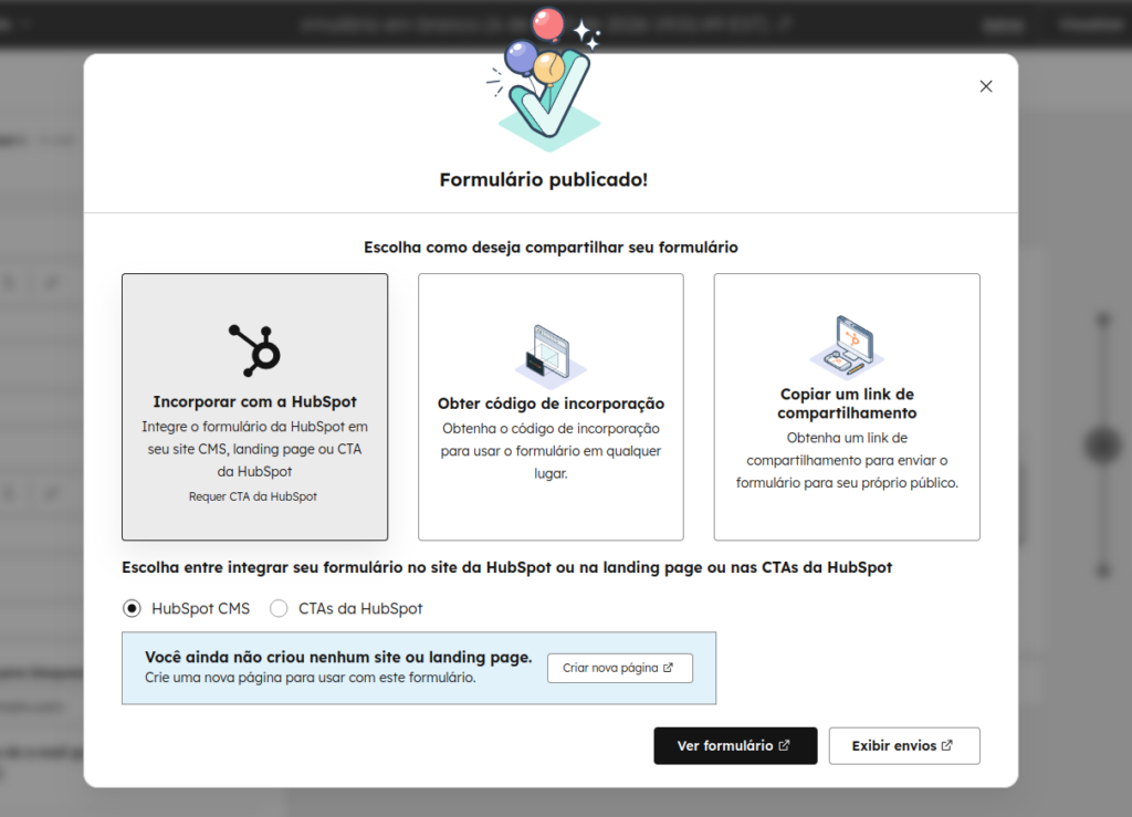 7. Irá aparecer um popup indicando que o formulário foi publicado com sucesso.