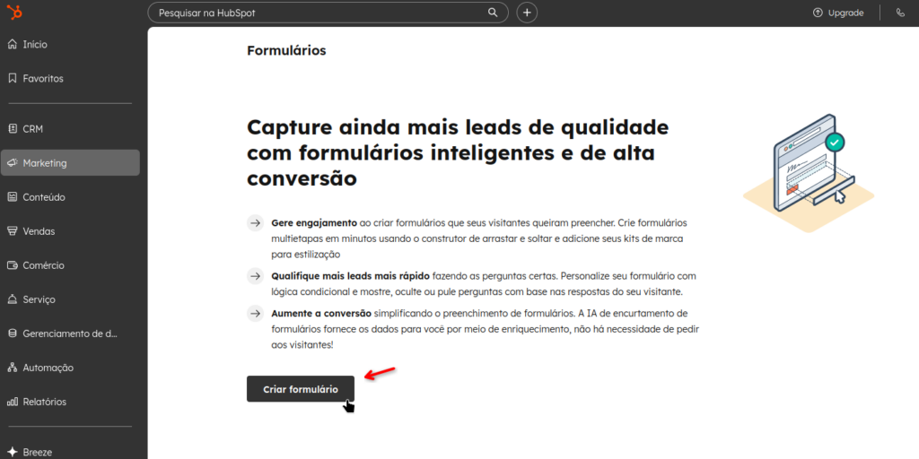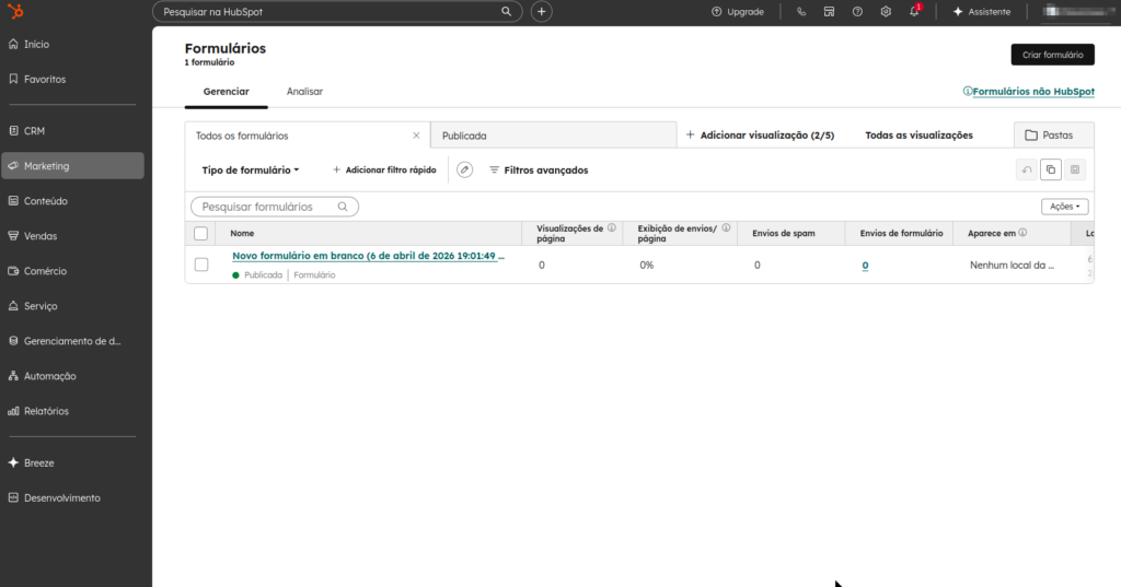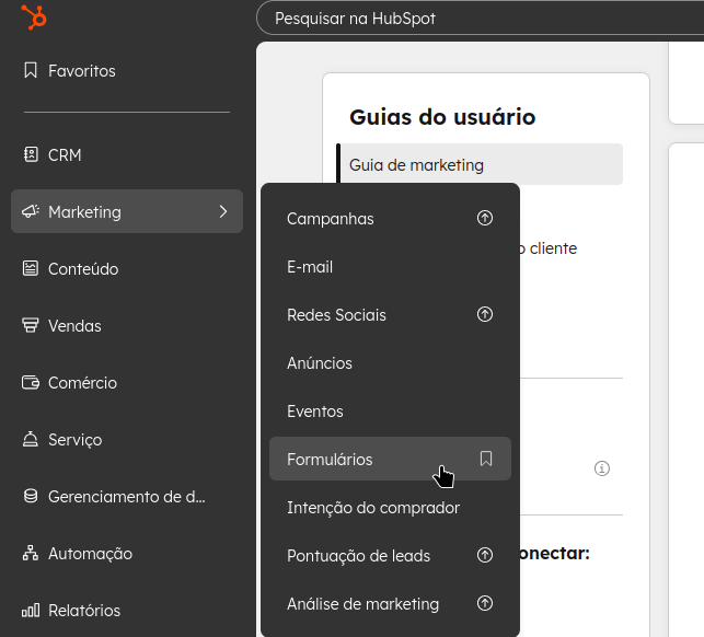 2. No menu lateral esquerdo, selecione “Marketing” > “Formulários”.