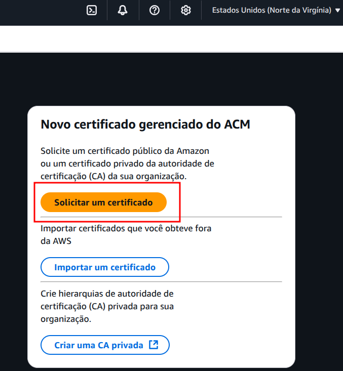 1. Acesse console.aws.amazon.com/acm, certifique de emitir o certificado na região Norte da Virgínia;
