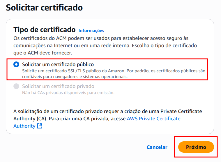 3. Na etapa Tipo de certificado, selecione a opção Solicitar um certificado público e clique em Próximo;