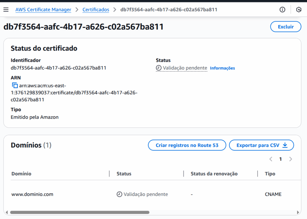 Depois que o status do certificado mudar para Emitido, os registros na tabela de DNS utilizados para a verificação não são mais necessário e podem ser excluídos.