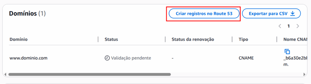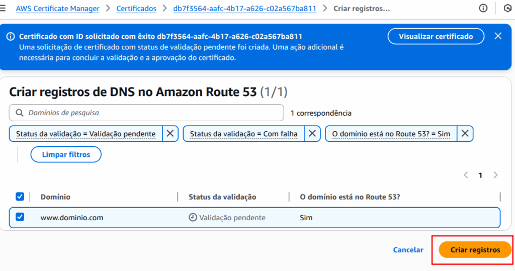 Caso o domínio esteja na AWS Route 53, clique no botão Criar registros no Route 53. E na tela seguinte clique em Criar registros.