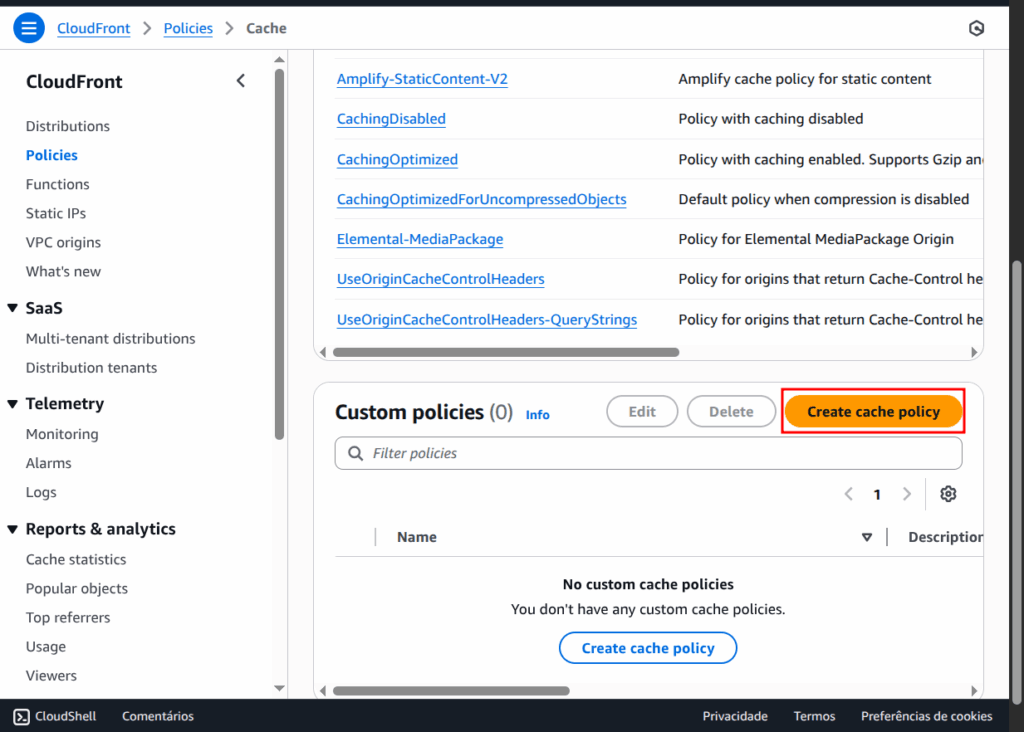 - Acesse as Políticas no console do CloudFront em https://console.aws.amazon.com/cloudfront/v4/home?#/policies.