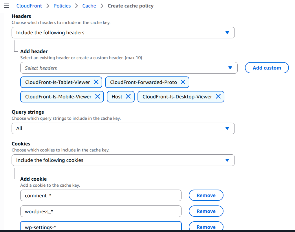 – Headers: CloudFront-Is-Tablet-Viewer, CloudFront-Forwarded-Proto, CloudFront-Is-Mobile-Viewer, Host, CloudFront-Is-Desktop-Viewer;