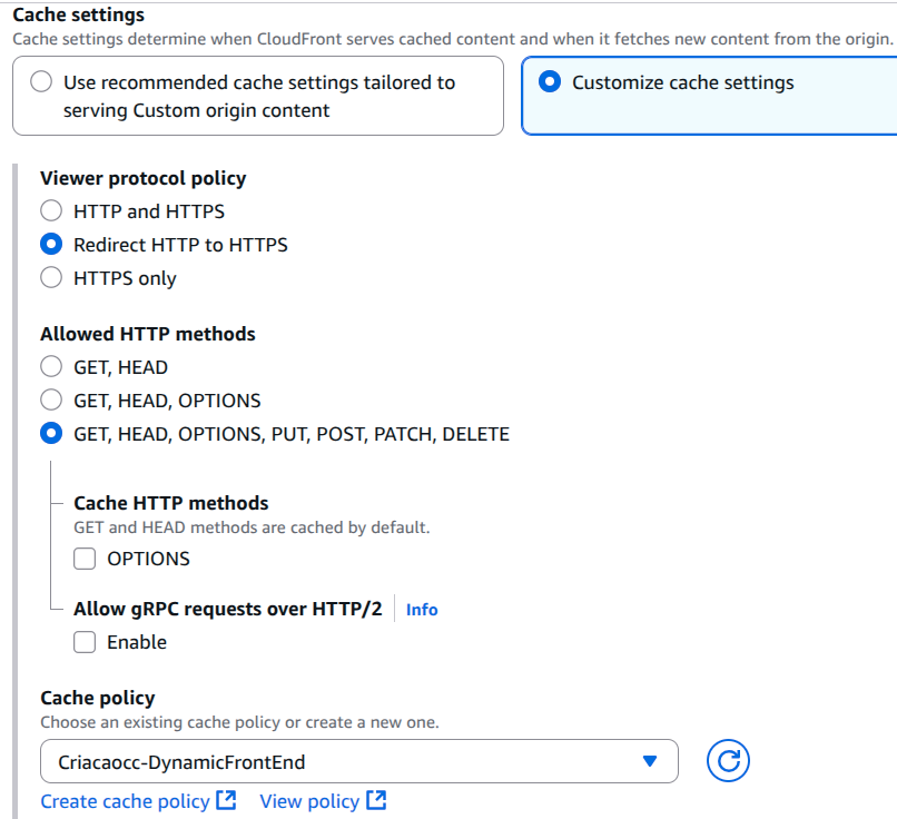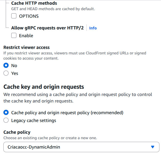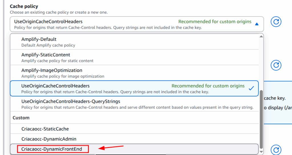 — Cache policy: Selecione a política criada anteriormente, Criacaocc-DynamicFrontEnd;