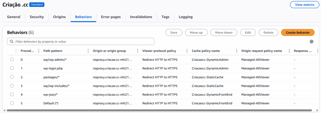Abaixo, incluímos uma captura de tela mostrando como as configurações devem ficar no painel das políticas do CloudFront. Isso ajudará a visualizar as opções corretas e evitar possíveis erros na configuração.